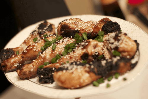 Повышаем температуру до максимальной и обжариваем 10 минут, постоянно перемешивая. Как только голени заглазировались, выложить их на тарелку, украсить кунжутом и свежим зеленым луком, предварительно нарезав его.