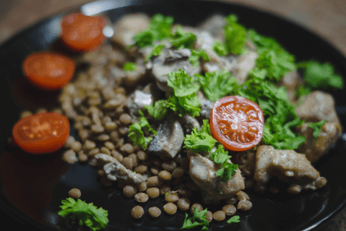 Чечевица с курицей и грибами, тушеными в сливках
