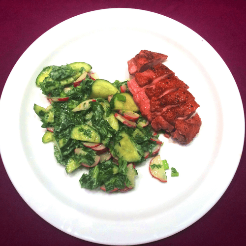 Утиная грудка с салатом из редиса и огурцов — это сочетание нежности и свежести. Блюдо берет свои корни в европейской гастрономии, где утка ценится за богатый, насыщенный вкус, а легкие овощные гарниры подчеркивают ее сочность. Грудка, пропитанная ароматом меда и специй, сначала обжаривается до золотистой корочки, а затем доводится до идеальной текстуры в духовке. Салат из редиса и огурцов добавляет пикантности и хрусткости, а натуральный йогурт с горчицей создает гармоничную кремовую заправку. Это идеальный выбор для изысканного ужина, где элегантность встречается с простотой. Блюдо прекрасно сочетается с белым вином или легкими травяными настоями, а его нежный вкус оставляет незабываемое впечатление.