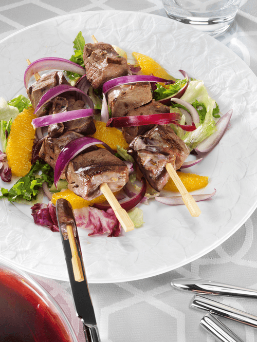 Разогреть гриль. Насадить ломтики сердца на шпажки и поджарить на гриле в течение четырех минут, один раз перевернув.