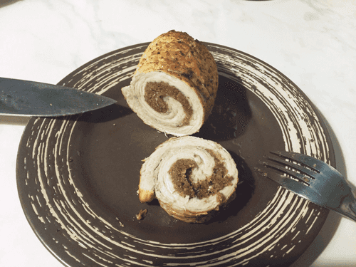 Рулет из свинины с пикантной начинкой — это изысканное блюдо европейской кухни, сочетающее насыщенный мясной вкус с ароматными нотами специй и пряностей. Истоки его рецепта восходят к традиционным мясным рулетам, популярным в разных европейских странах. Главная особенность этого блюда — контраст текстур: нежное мясо, хрустящая начинка из бородинского хлеба и пикантность пармезана. Сливочное масло придает сочность, а ароматные травы — изысканный букет вкусов. Рулет прекрасно подходит как для торжественного ужина, так и для уютного семейного застолья. Подавать его можно с легким овощным гарниром или пряным соусом, подчеркивающим богатство вкуса.