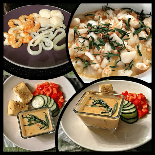 Морепродукты в сырно-сливочном соусе с чесночными гренками