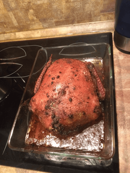 Запекать утку в духовке при 180 градусах в течение 1,5 часа.