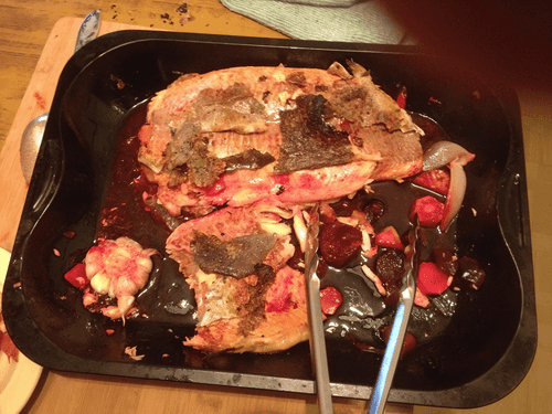 Достаем противень и проверяем рыбу на готовность. Если расслаивается — рыба готова. Аккуратно снимаем с филе кожу и кладем ее обратно в духовку под гриль. По минуте с каждой стороны и у вас получился деликатес. Рыбу поливаем соком из противня, он получается прекрасного темно-бардового цвета, и сбрызгиваем лимонным соком.