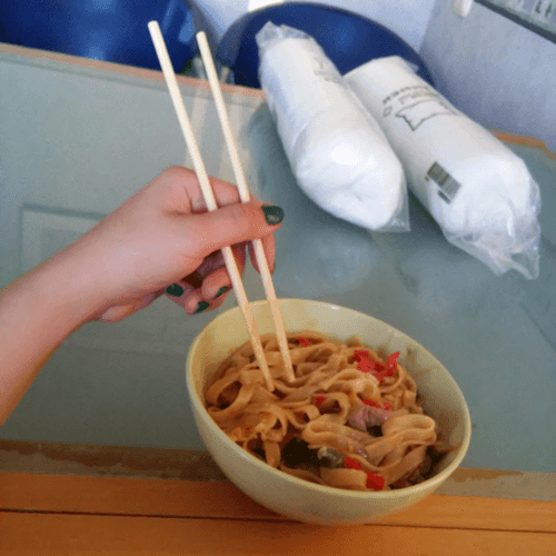 Пшеничная лапша с курицей в соево-медовом соусе