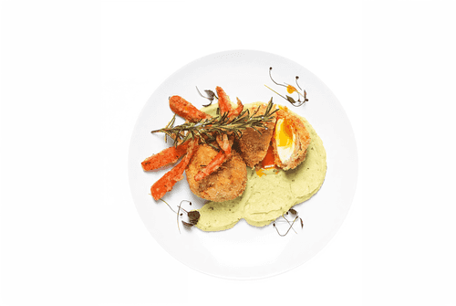 Нагреть два сотейника с маслом для фритюра — до температуры 175–180 градусов. В одном обжарить бомбочки до золотистого цвета и выложить на бумажные полотенца, чтобы убрать лишний жир. В другом обжарить розмарин и разрезанные на четвертинки вдоль моркови, предварительно окунув их в ледяной кляр.