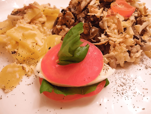 Куриный жюльен в портобелло с запеченным картофелем и капрезе