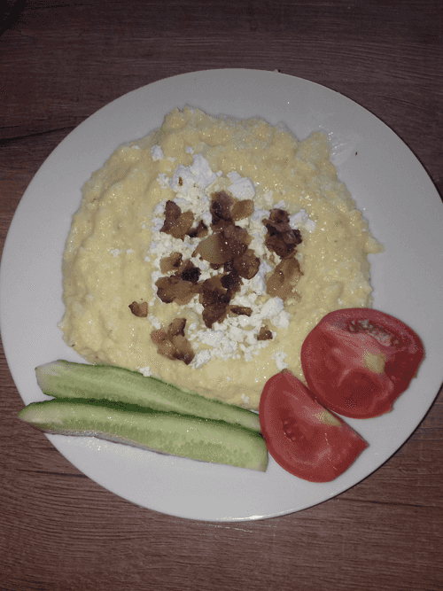 Готовое блюдо выложи слоями, не перемешивая ингредиенты: сначала банош, а сверху брынзу, шкварки и грибы. Банош едят, не смешивая, а берут каждый компонент понемногу.