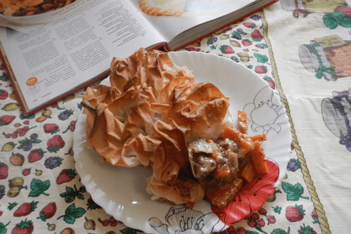 Разрежьте листы теста фило на квадраты 9-12 см. Слегка смажьте квадраты с одной стороны оставшимся маслом, несильно скомкайте и положите масляной стороной вверх, на начинку. Выпекайте 25-30 минут, пока тесто не станет хрустящим и золотистым.