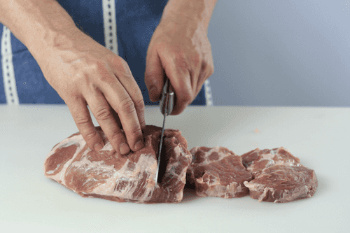 Мясо нарезать порционными кусками (примерно 1 см толщиной).