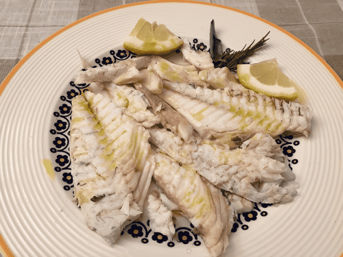 По готовности рыбу вынуть из фольги и филировать с помощью ложки, отделив: кожу, голову, хвост, кости и плавники