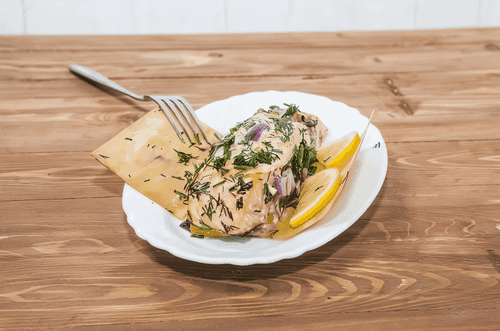 Лосось с лимоном, запечённый в гриль-бумаге — это изысканное блюдо европейской кухни, сочетающее в себе простоту приготовления и богатство вкуса. Эта кулинарная техника восходит к традициям запекания в природных материалах, что сохраняет сочность и насыщенный аромат рыбы. Лосось, пропитанный маринадом из свежего укропа, лука и лимонной цедры, приобретает пикантные цитрусовые нотки, а тонкие дольки лимона придают освежающую кислинку. Запекание в гриль-бумаге обеспечивает деликатную текстуру и насыщенный вкус, позволяя сохранить полезные свойства рыбы. Подаётся как изысканное блюдо на ужин или легкий праздничный ужин. Идеально сочетается с овощами на гриле, свежим салатом или мягким белым вином.