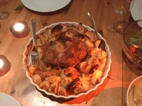 Через час достаем противень, снимаем фольгу, поливаем мясо растопленным жиром и соком, убираем шкварки на отдельную тарелку и закладываем картошку.