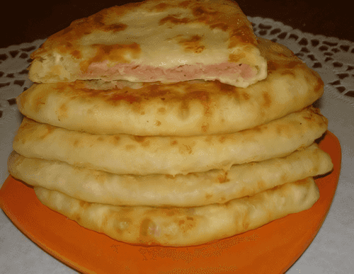 Полученное тесто разделить на колобки, раскатать небольшую лепешку (можно пожарить так), положить начинку (у меня — ветчина). Можно положить сыр другого вида, тоже очень вкусно. Соединить края и немного раскатать.