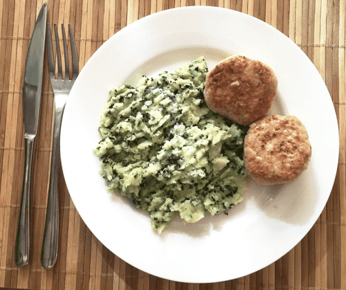 Приготовить картофельное пюре и добавить в него предварительно измельченный шпинат.