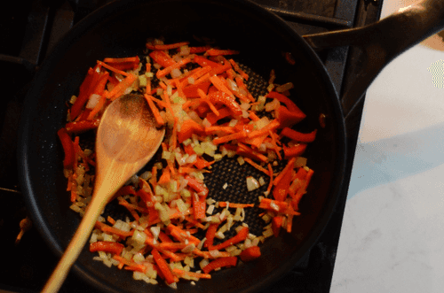 Греем сковороду с 1 ст.л. масла. Выкладываем овощи и пассируем до мягкости, добавляем чеснок и грибы.