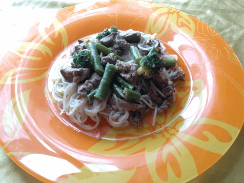 Рисовая лапша с куриной печенью и овощами
