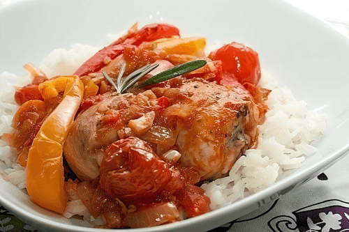 Вылейте получившийся соус на курицу, сверху разложите полоски перца, помидоры черри (не пренебрегайте ими, это очень украшает вкус блюда). Веточки розмарина тоже положите сверху.
