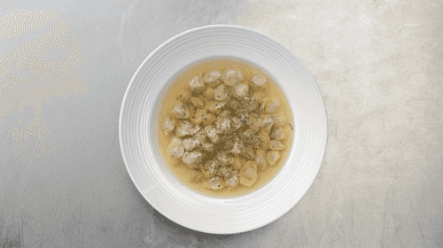 Вскипятить бульон и отправить туда всю дюшбару. Когда дюшбара всплывет, добавить мяту.