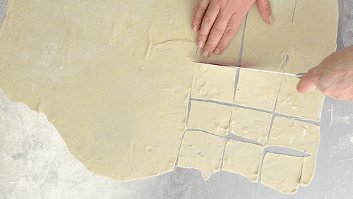 Тесто раскатать до толщины 1 мм и разрезать на квадраты 2х2 см.