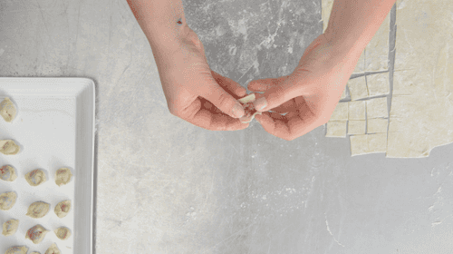 В каждый квадратик положить немного фарша, слепить два противоположных угла между собой, после чего соединить другие два угла. Должны получиться небольшие пельмешки.