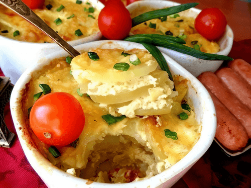 Ставим в горячую духовку и запекаем, пока картофель не впитает в себя сливки и не проготовится.