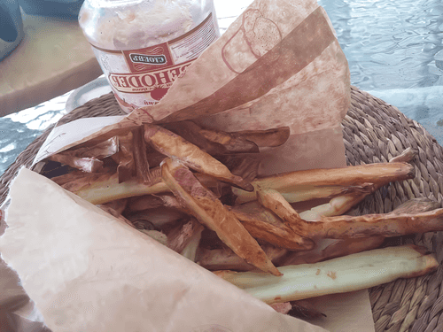 Картофель нарезать соломкой, как на чипсы, обсушить бумажным полотенцем.