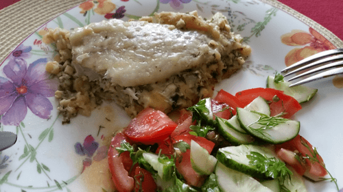 На смазанную маслом фольгу положить цельный кусок филе, на него — слой фарша, закрыть вторым куском и посыпать тертым сыром.