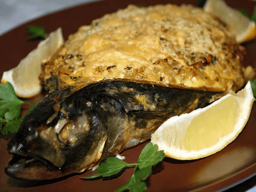 Рыбу заполнить приготовленной начинкой, поместить на противень и запекать при температуре 180С 35 минут.