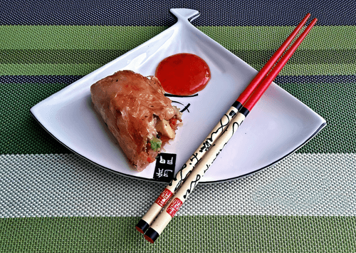 Сделав 12 роллов, раскаливаем сотейник с толстыми краями, вливаем туда растительное масло, и опускаем туда роллы, так, чтобы при жарке они не соприкасались друг с другом (обычно помещается 2-3 ролла) Обжариваем до образования на всей поверхности ролла золотистой корочки. Вытаскиваем шумовкой, промакиваем лишний жир бумажным полотенцем.