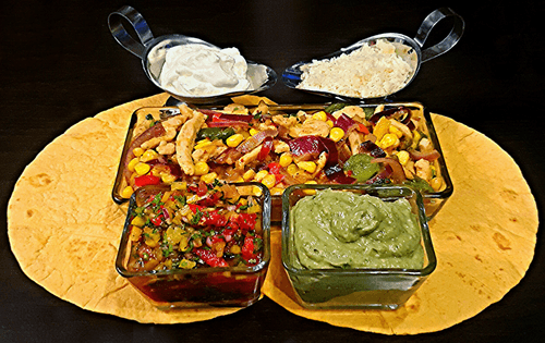 Подавать с сметаной, соусами и тертым сыром и кукурузными тортильями.