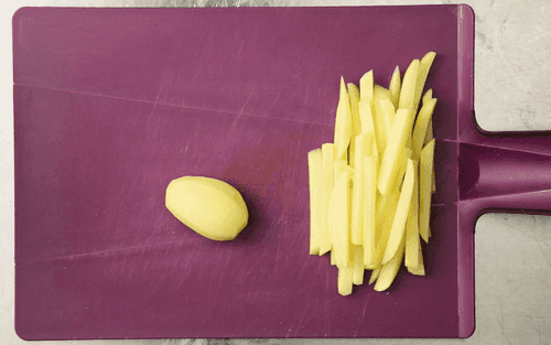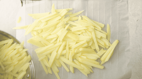 Тем временем помыть и очистить картофель, разрезать на палочки 1,5 см толщиной. Но совершенно не обязательно нарезать идеально ровные бруски, в этом есть своя прелесть. Как следует промыть картофель под холодной водой 2–3 минуты, чтобы вымыть лишний крахмал.