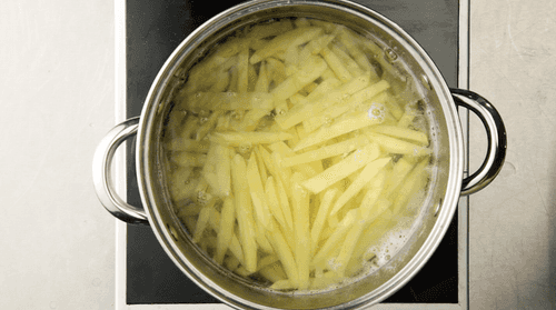 В глубокой кастрюле довести до кипения слегка подсоленную воду. Отварить картофель до мягкости. Важно поймать момент, когда картофель чуть-чуть начал разваливаться, поэтому его лучше варить на медленном огне. Именно эти маленькие трещины позволят чипсам стать особенно хрустящим при последующей обжарке.