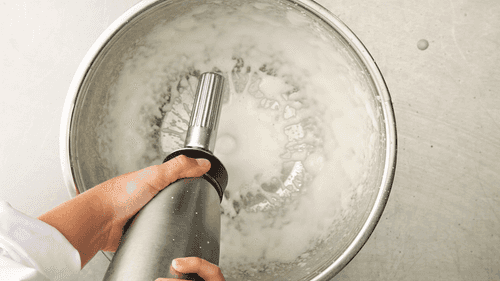 Перелить массу в сифон, даже если остались небольшие комки. Зарядить сифон 3 баллончиками и убрать в холодильник на 30 минут.