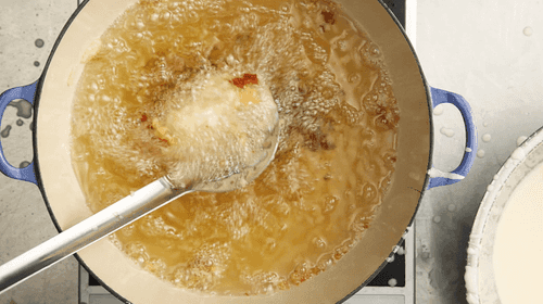 Как следует встряхнуть сифон и выдавить немного кляра в глубокую чашу. Не стоит выдавливать слишком много — кляр тут же начнет терять пузырики. Окунуть рыбу в кляр и опустить в кипящее масло.