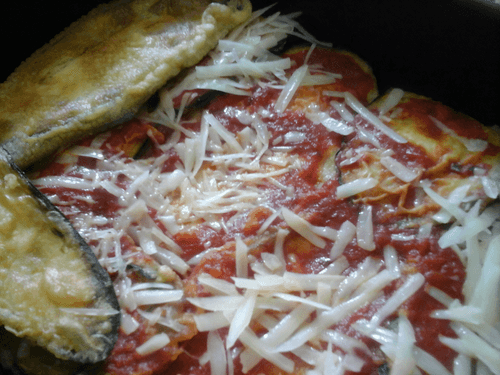 В посуду, заранее смазанную растительным маслом, выкладывать слоями: баклажаны равномерным слоем (как можно теснее друг к другу), соус из помидоров, тёртый сыр – повторить несколько раз. Для удобства можно зрительно разделить ингредиенты на 3-4 части (в зависимости от размеров формы, в данном случае будет оптимальной форма 20х20 см), последний слой залить соусом так, чтобы он полностью заполнил форму.