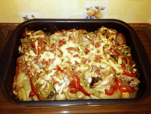 Запеченная курица в сливочном соусе с овощами и картофелем