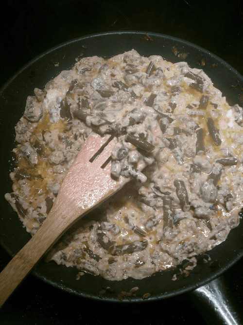 Снять крышку, выпарить половину воды, и добавить сметану, хорошо перемешать. Подержать еще минут 5 на плите и можно снимать.