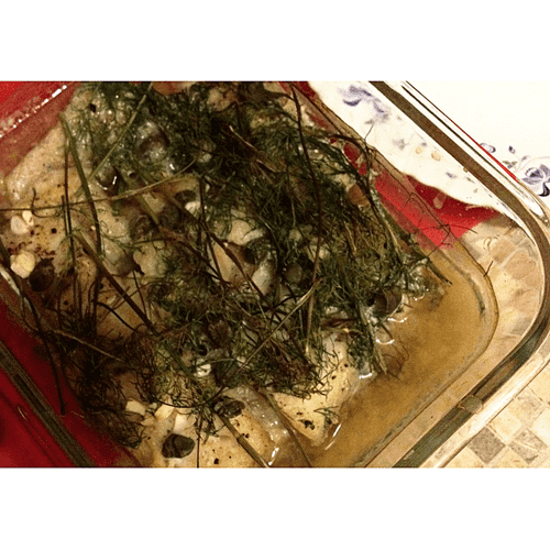 Стебли укропа также промыть, просушить и уложить сверху на рыбу.
