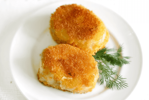 Соединить края лепёшек, сформировать зразы и запанировать в сухарях.