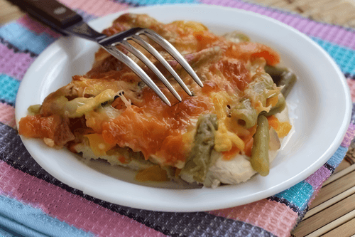 Курица, запеченная с овощами, – это уютное блюдо русской кухни, объединяющее в себе нежность белого мяса и яркость свежих овощей. Исторически запекание было одним из основных способов приготовления в русских деревенских печах, позволяя сохранить сочность ингредиентов. В этом рецепте куриное филе гармонично сочетается с сладким перцем, кабачком, морковью и томатами, создавая насыщенный вкус с легкой пикантностью чеснока и черного перца. Добавление сыра придает блюду мягкость и аппетитную золотистую корочку. Это универсальный вариант для семейного ужина или праздничного стола – питательный, ароматный и полезный. Прекрасно сочетается с свежими травами и легкими гарнирами, а также подойдет для тех, кто следит за сбалансированным питанием.