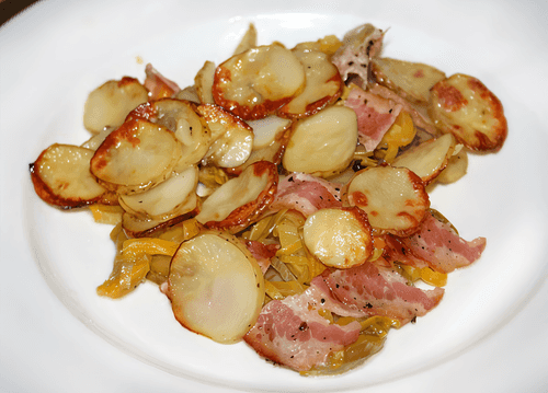 Запеченный картофель с салом — традиционное русское блюдо, воплощающее простоту и насыщенный вкус деревенской кухни. Исторически оно зародилось как сытная и доступная еда для крестьян, но со временем стало любимым угощением на застольях. Картофель, пропитанный ароматом топящегося сала, приобретает золотистую корочку и мягкость внутри, а добавленный лук придаёт сладковато-пряный оттенок. Блюдо отлично сочетается с маринованными овощами, свежими травами и ржаным хлебом. Его можно подавать как самостоятельное угощение или в качестве гарнира к мясным блюдам. Простой в приготовлении, но невероятно вкусный, запеченный картофель с салом — это уют и тепло домашней кухни, передающее традиции вкуса из поколения в поколение.