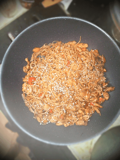 Обжаривать лапшу в растительном масле 4-5 минут до тех пор, пока лапша не станет эластичной, затем добавить соевый соус с чесноком и обжаривать около 3 минут.