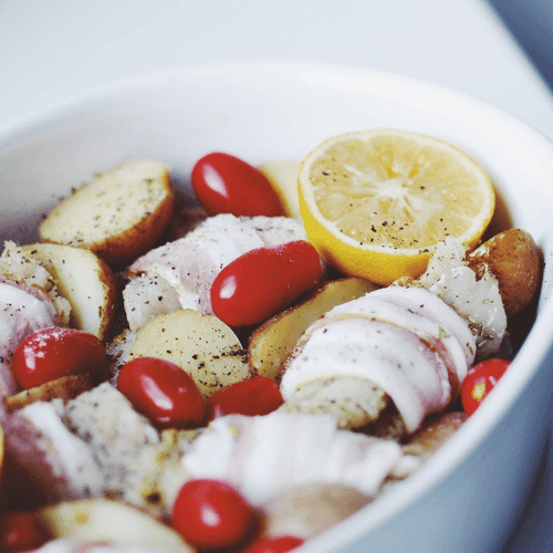Треска, запеченная в духовке с картофелем, помидорами и беконом