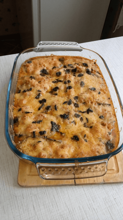Последний слой — томатный соус и сыр — присыпать смесью панировочных сухарей, оливкового масла и листьев орегано. Запекать в духовке при 190 С в течение полу часа. Блюдо можно подавать как горячим, так и охлажденным.