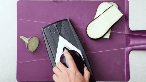 У баклажанов отрезать плодоножки и нарезать на слайсы толщиной 1 см. Сильно разогреть сковороду гриль (можно заменить ее обычной, стальной). По очереди обжарить баклажаны до красивого золотистого цвета.