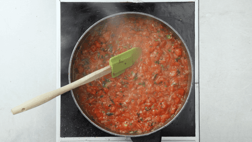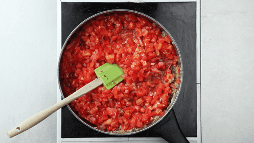 Добавить томаты в сковороду к луку и орегано. Как следует перемешать, накрыть крышкой и оставить на медленном огне на 15 минут.