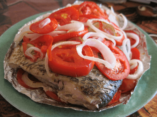 Нарезать лук кольцами, а помидоры кружочками. Из фольги сделать карман, выложить в него нарезанные овощи, затем рыбу и снова овощи. Закрыть карман и сделать сверху пару надрезов.