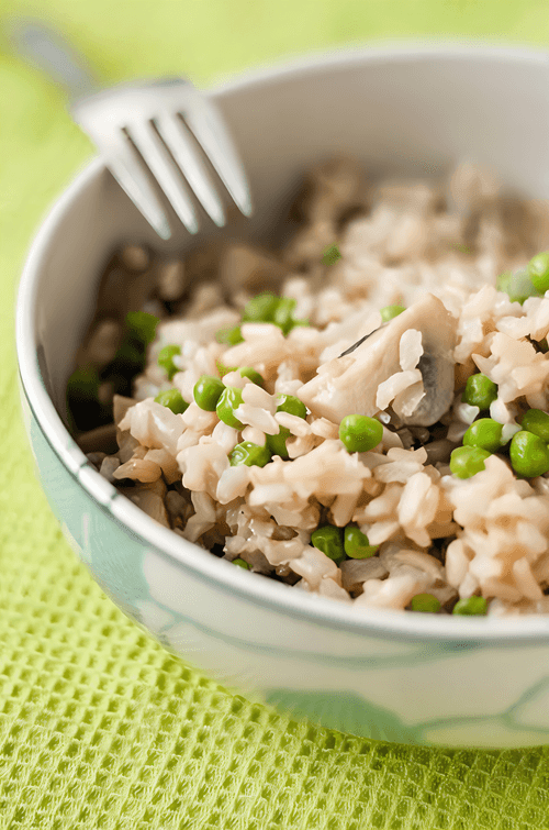 Бурый рис с грибами и зеленым горошком