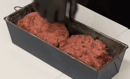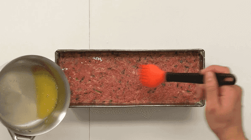 Глубокую, узкую форму (наиболее напоминающую ту, что используют для выпечки хлеба) смазать сливочным маслом. Влажными руками выложить мясо в форму.